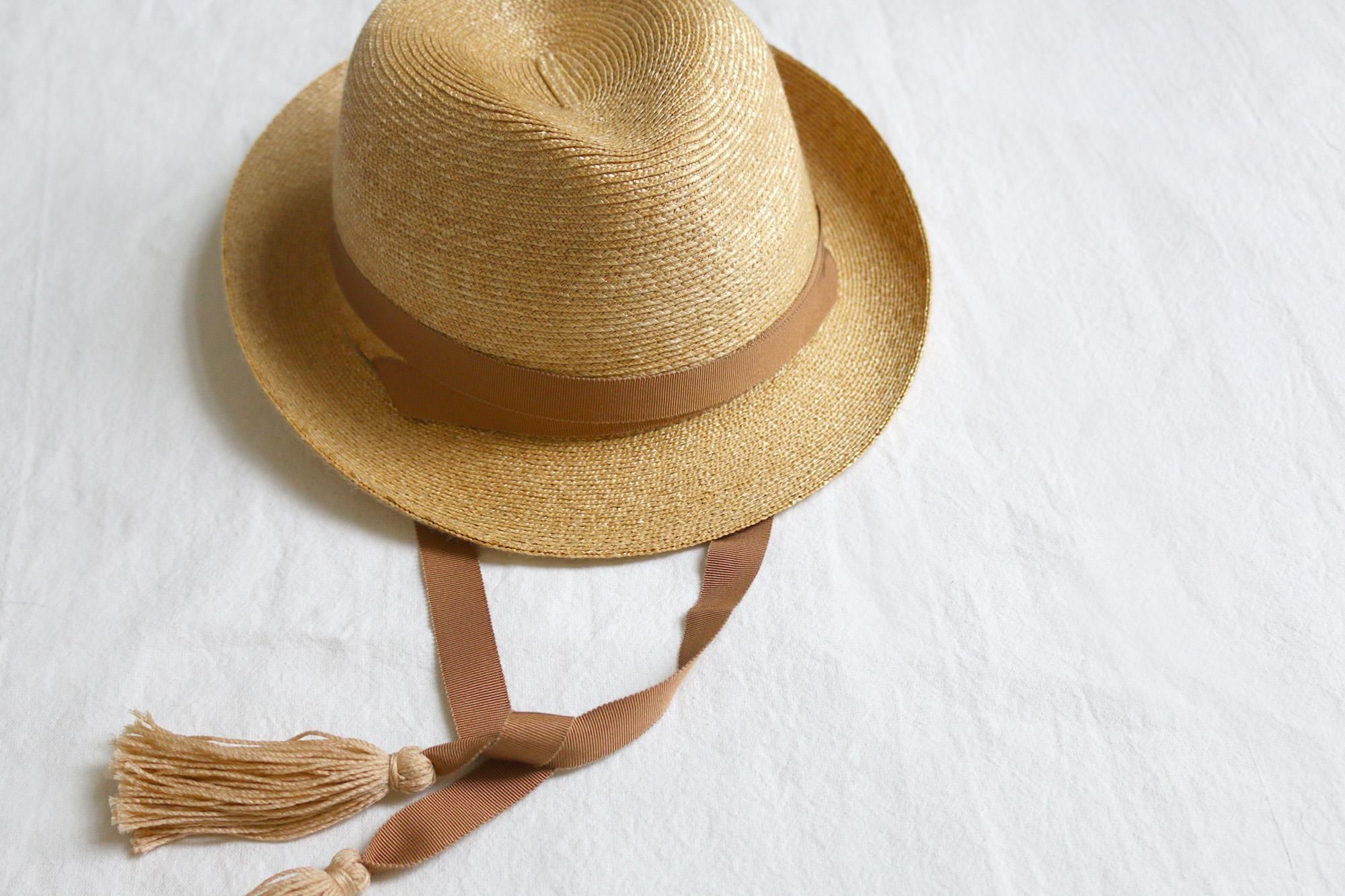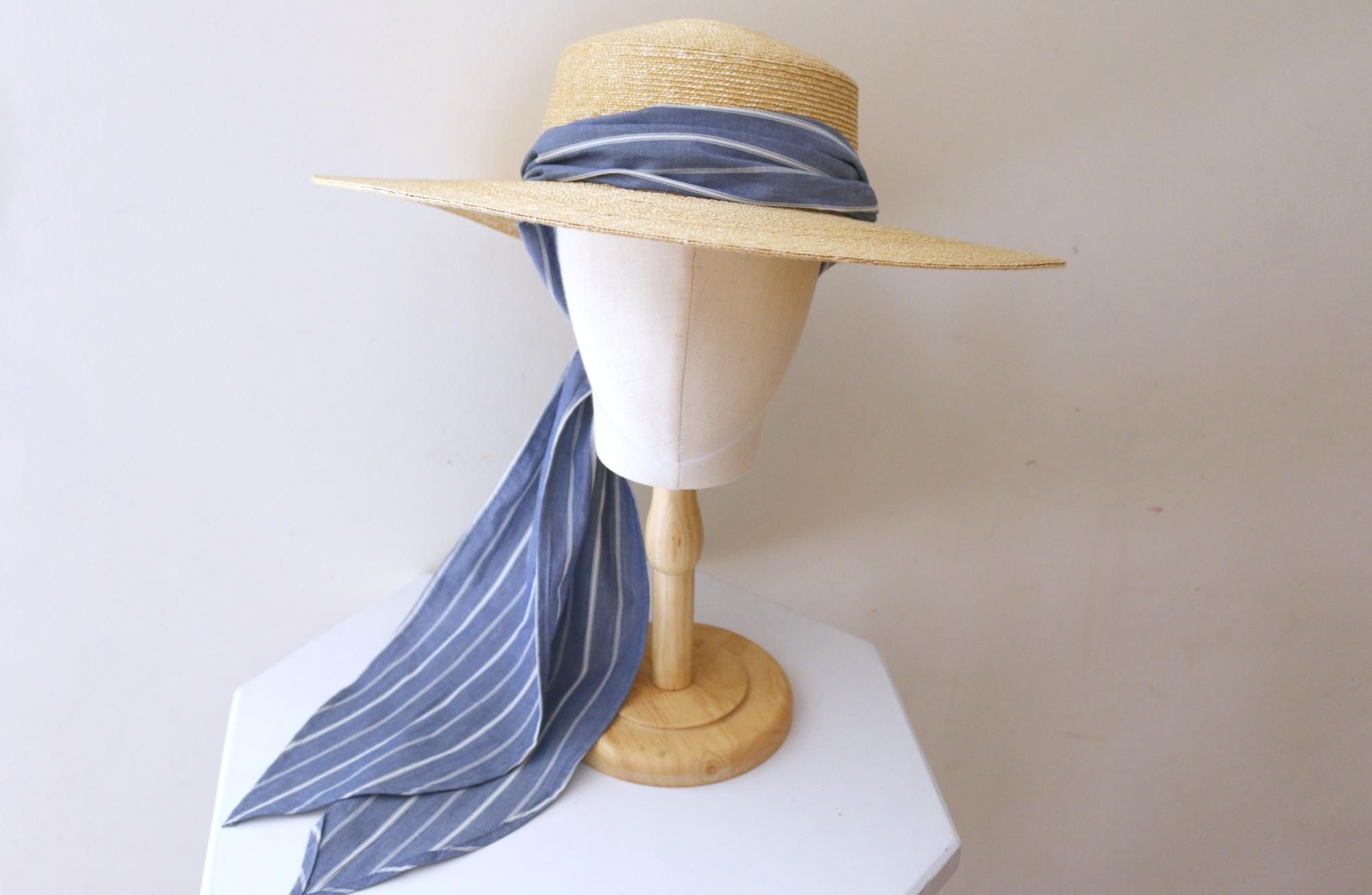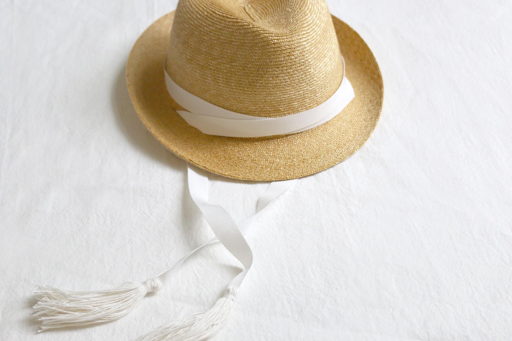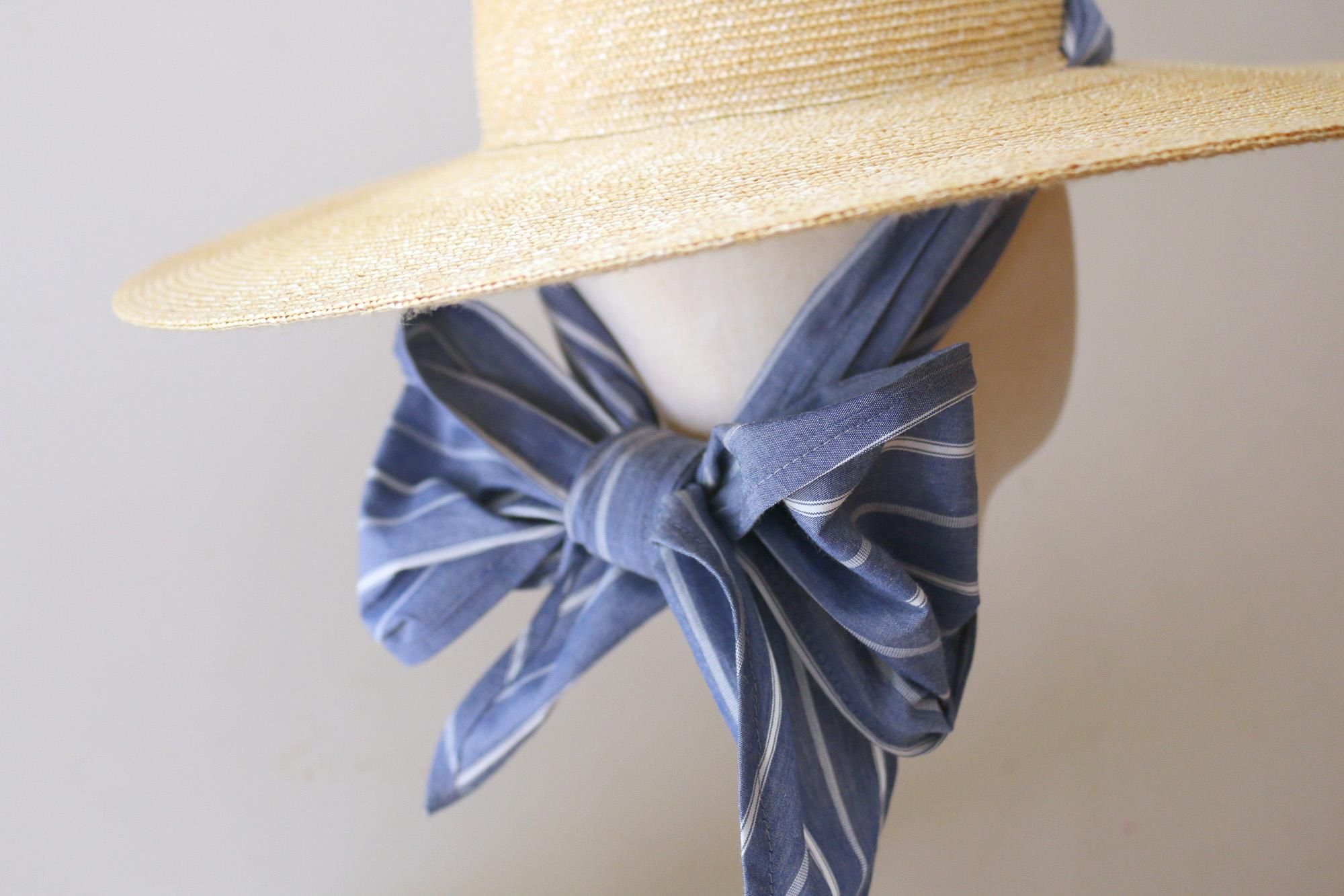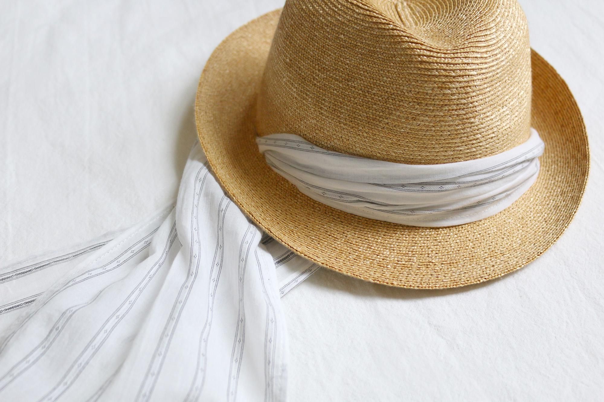 スリット付きの麦わら帽子に取り替えて使用できる帽子用スカーフとタッセルリボン。